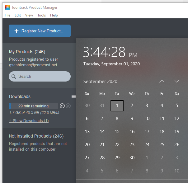 7.1 gig of Metal Foundry . I have download speed from internet of 231 mb/s and yet on Toontrack goes from high of 25 mp/s to 100KB/s.. took me 4 hours to download my Superior Sound Content 4. this is ridiculous with my New PC of 32 Gig Ram. 3.9 average speed AMD Cpu and tons of hard drive space not filled up yet… I have the original install discs for Superior 2 Content going to bring them out and use. But for Superior 3 only download is available. I had all the sounds saved on a drive from my old PC. But due to new PC windows 10 and older one Windows 7 does not recognize them at all. I wonder why ?