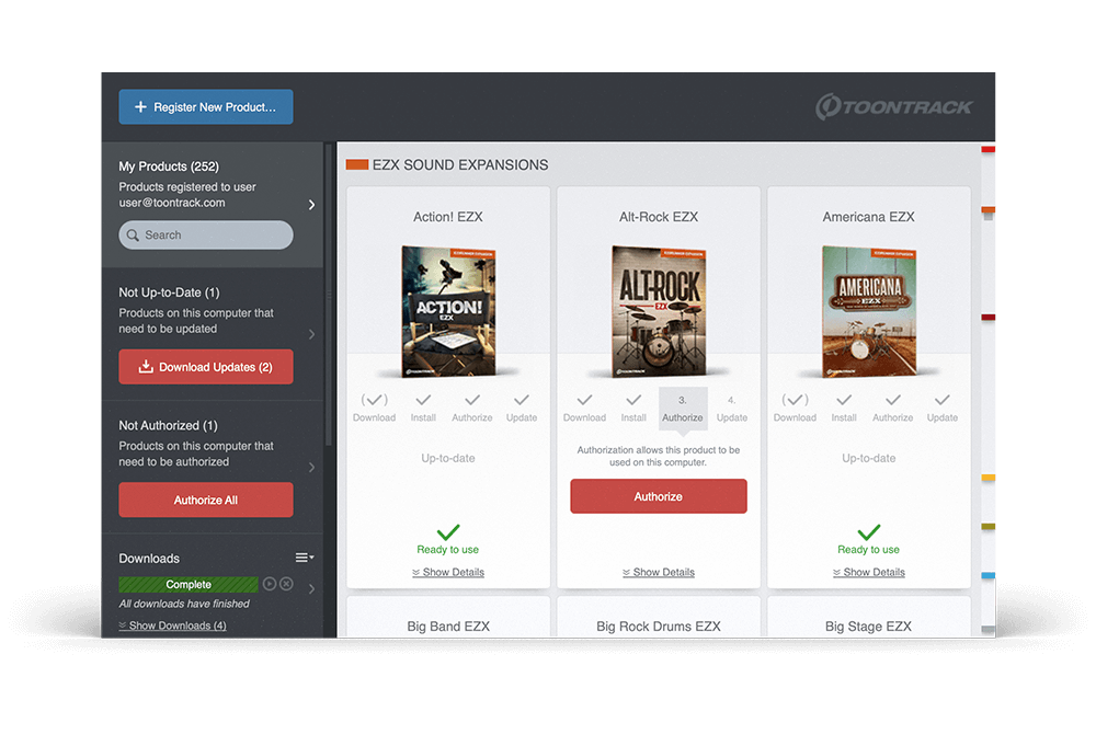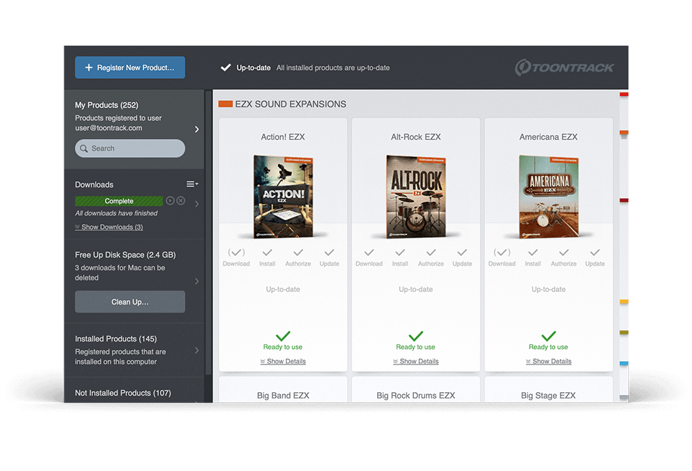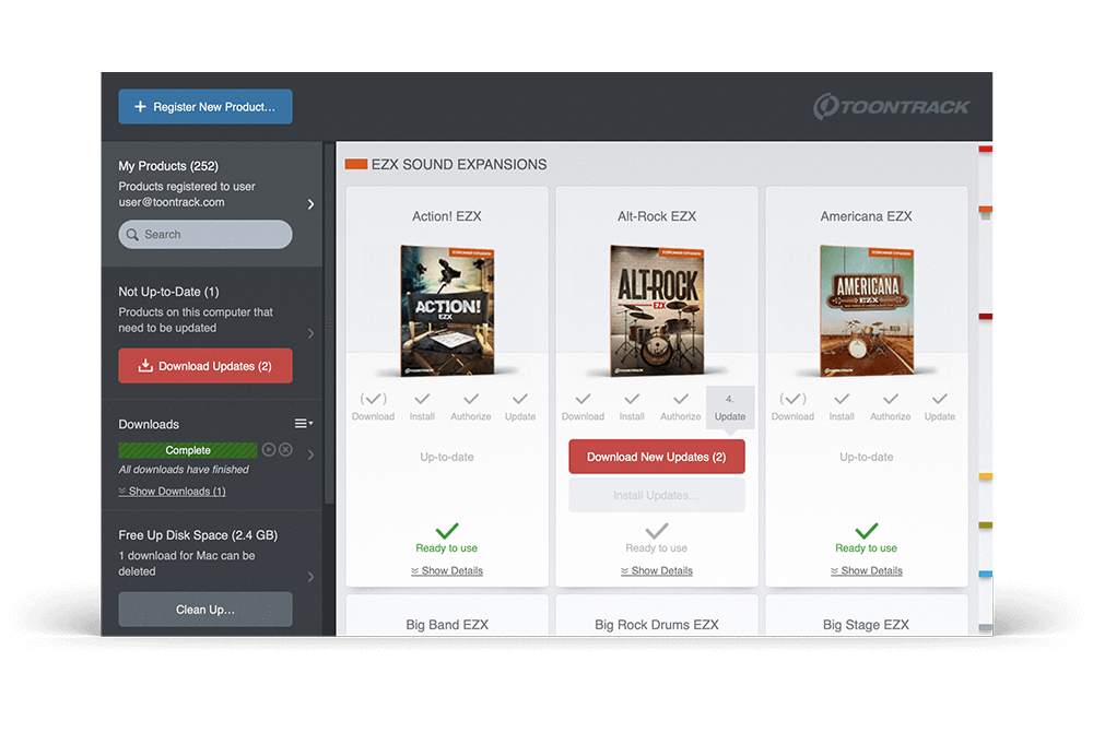 Register, download, install, authorize and update all your Toontrack gear – all in one application.