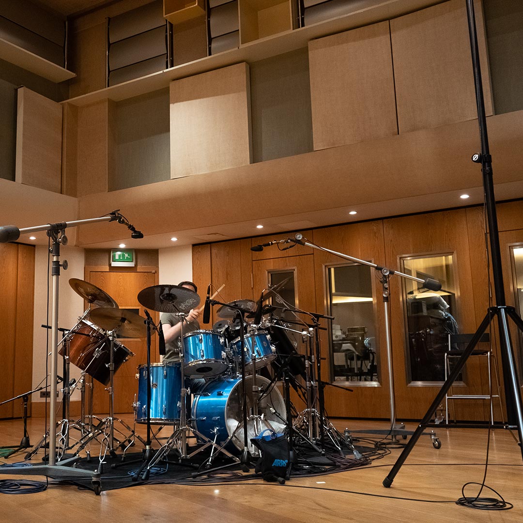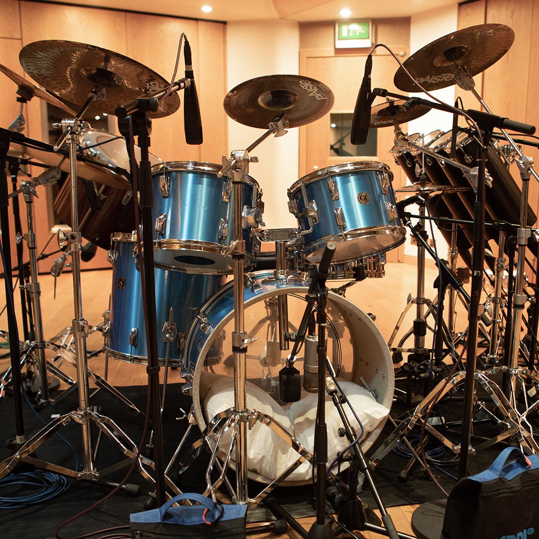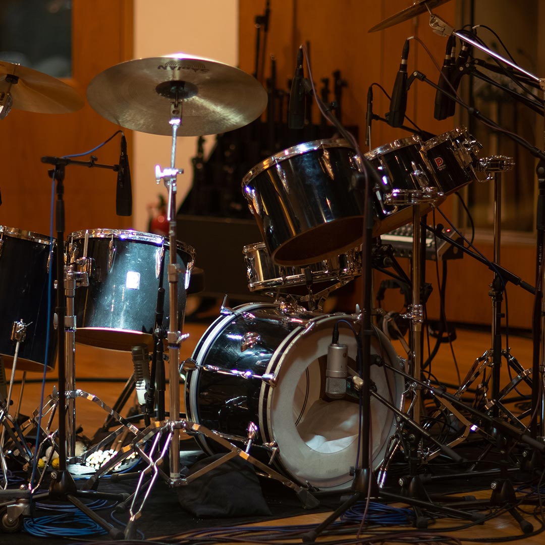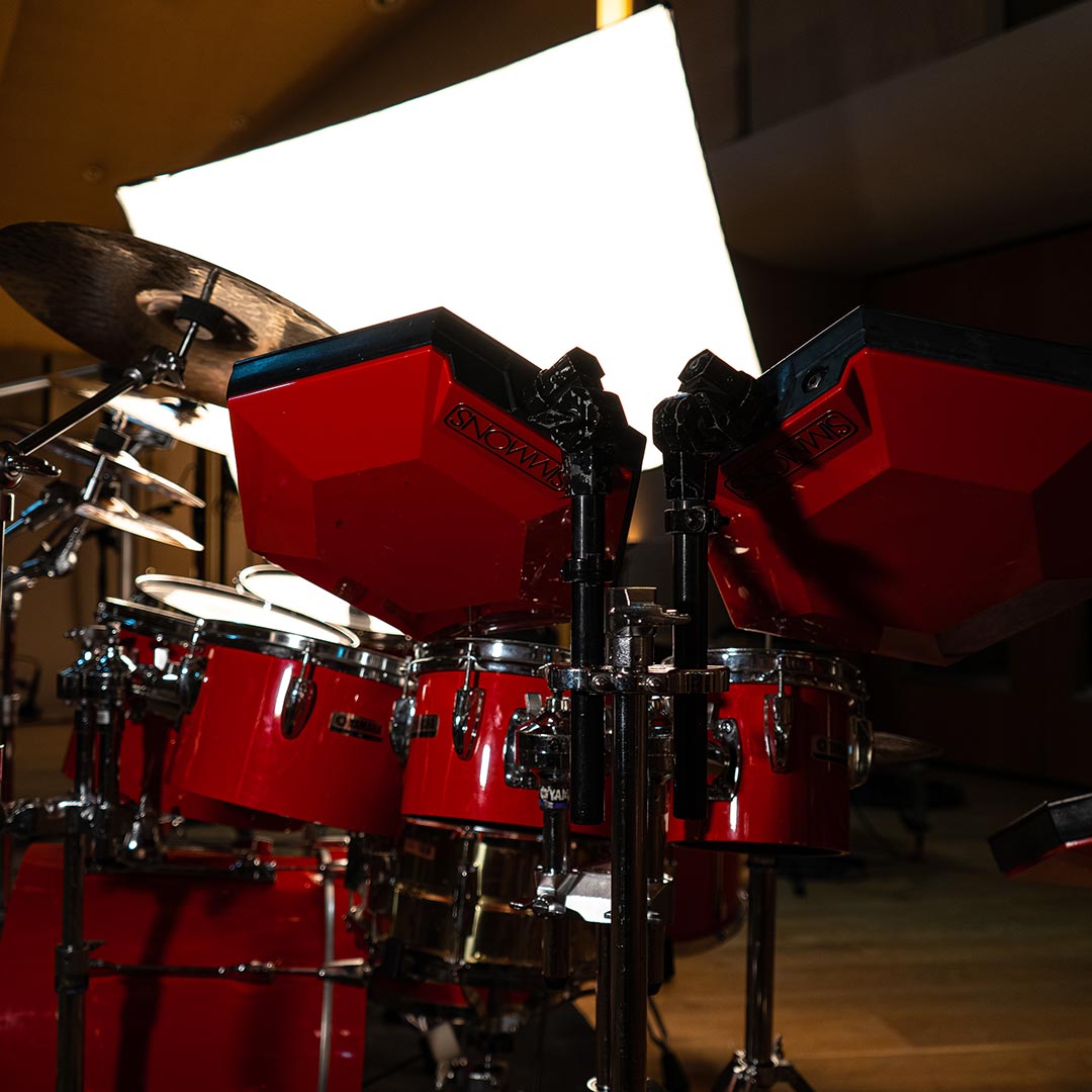 Acoustic drum kits and re-amped machines, captured in the same ambience.
