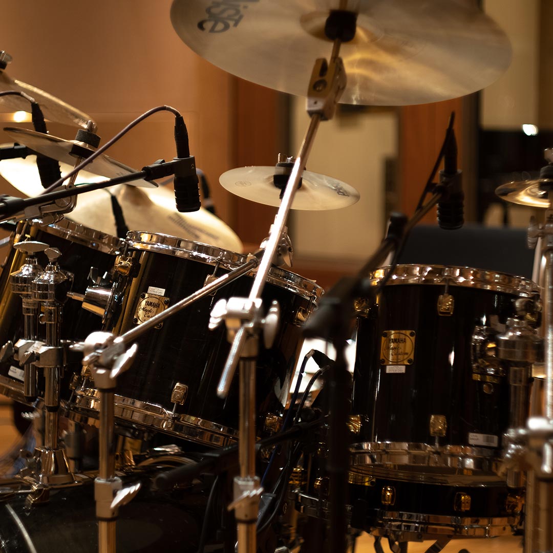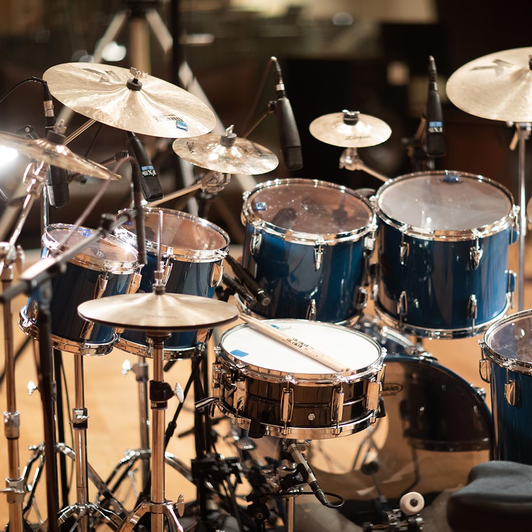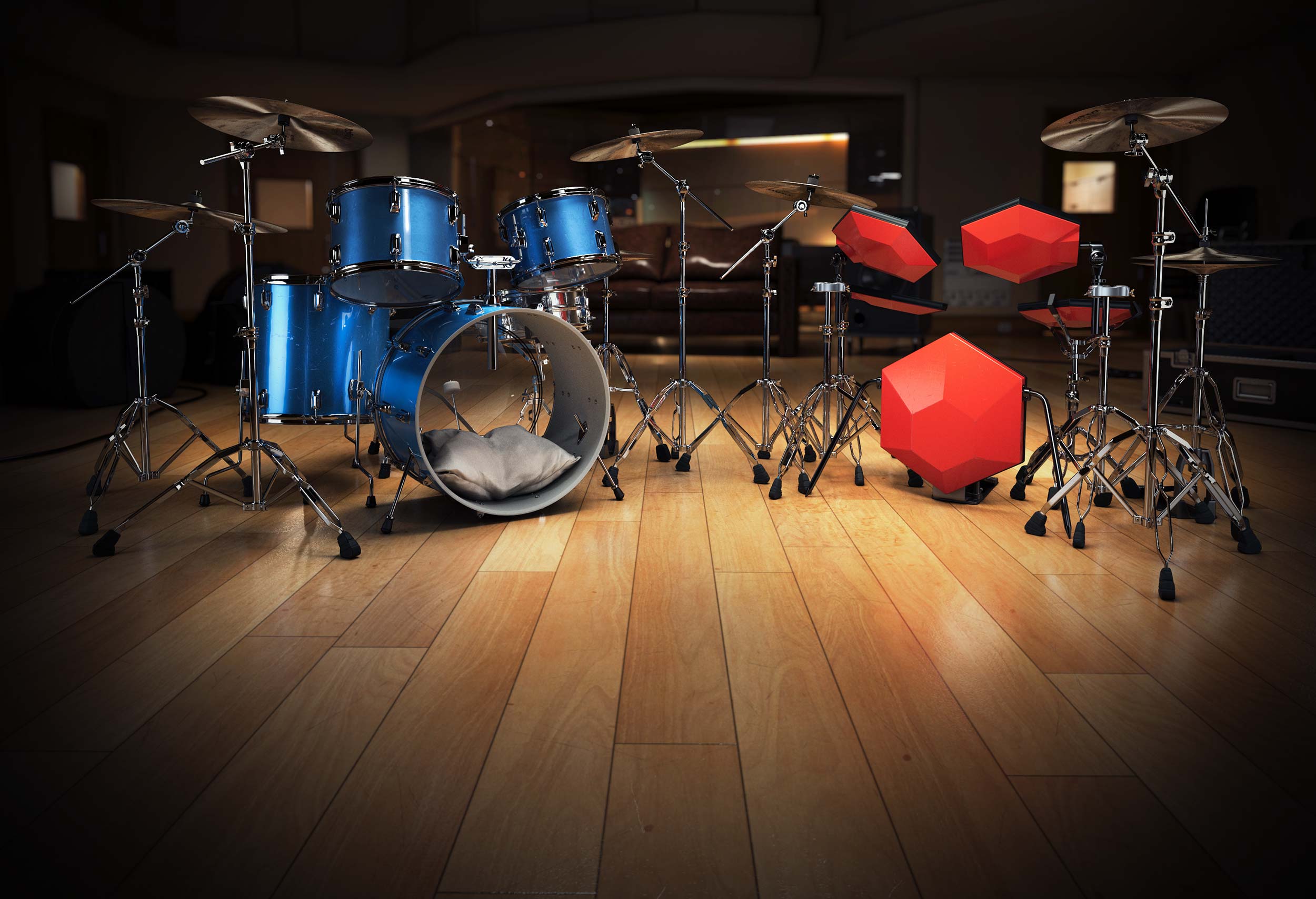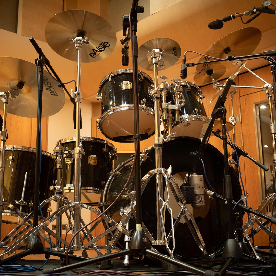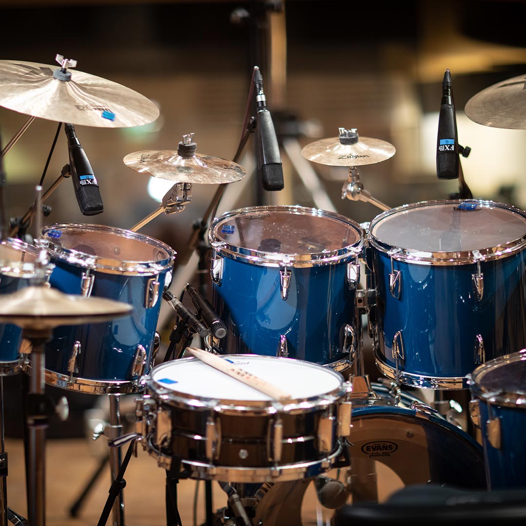 Acoustic drum kits and re-amped machines, captured in the same ambience.