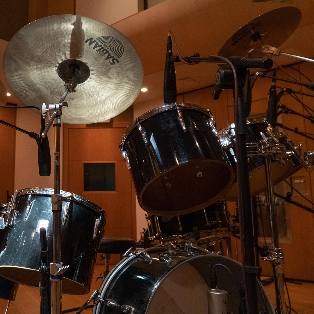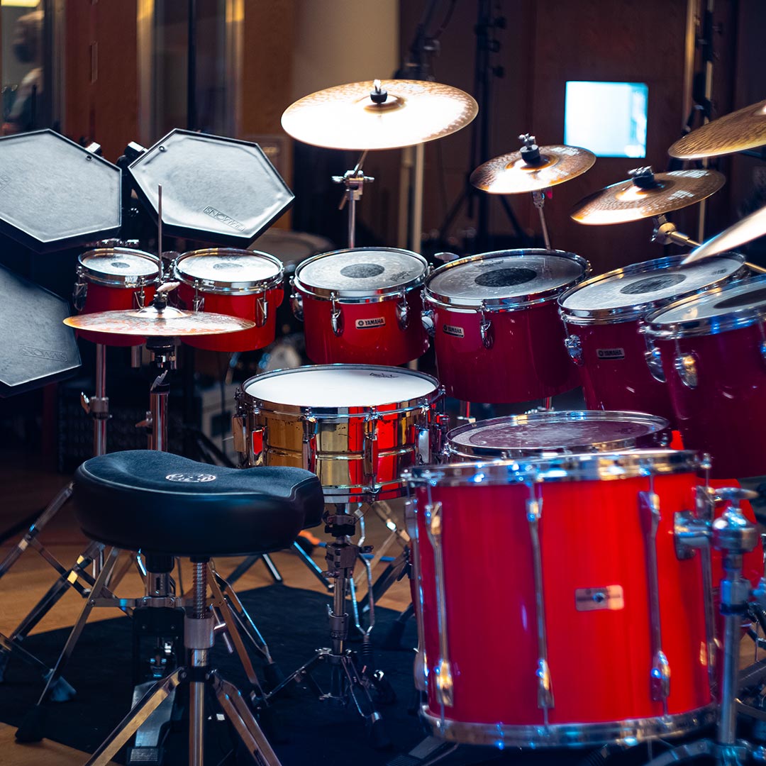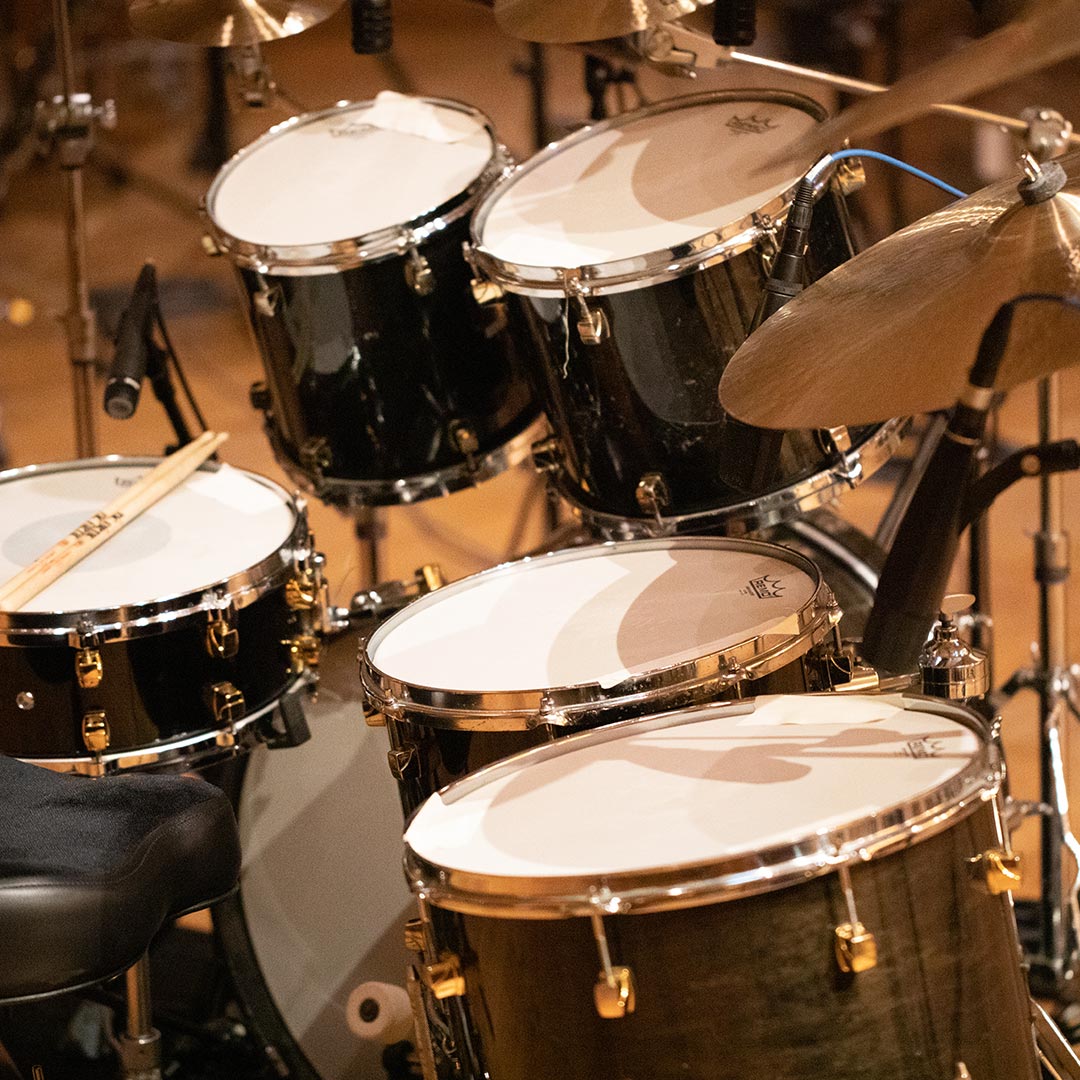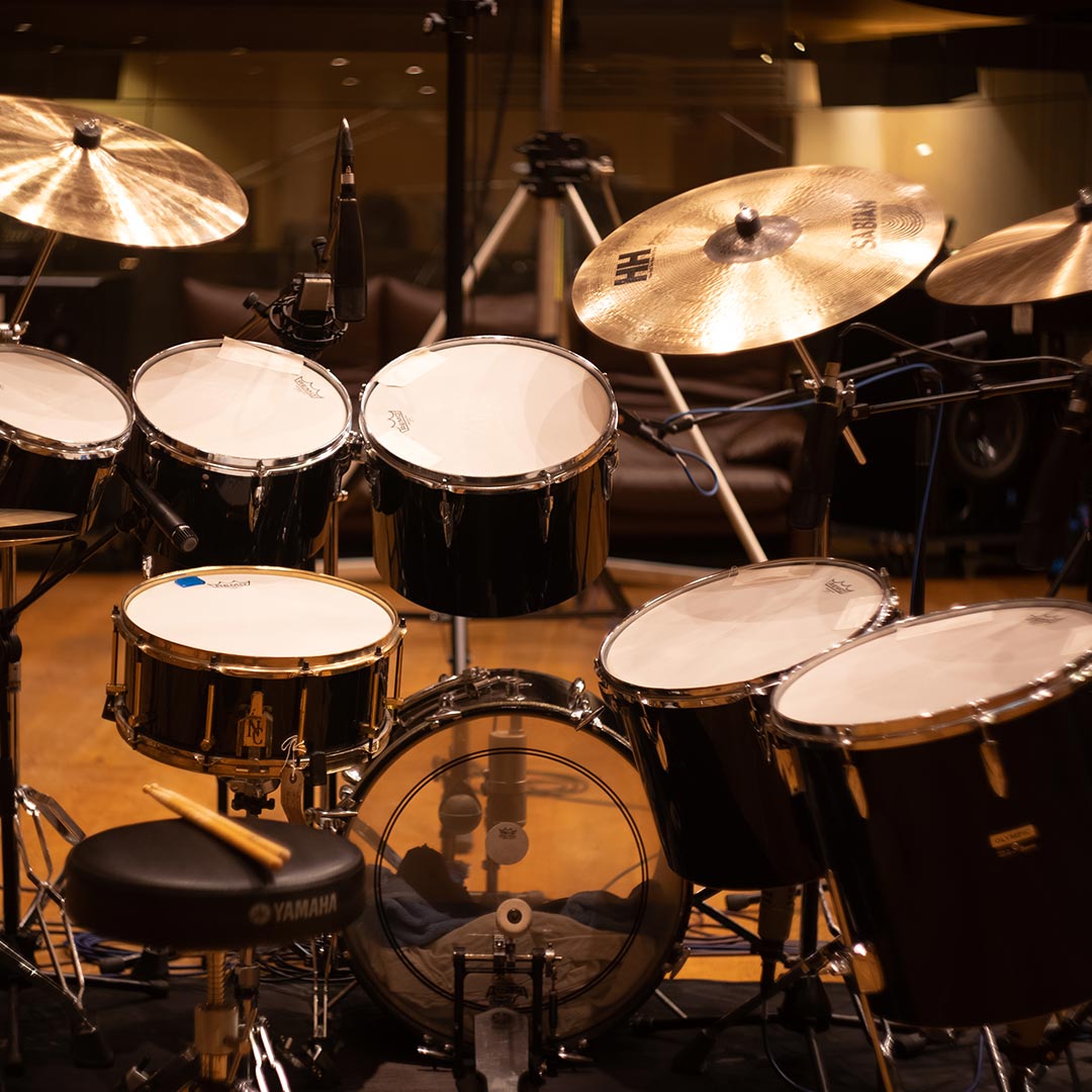 Acoustic drum kits and re-amped machines, captured in the same ambience.
