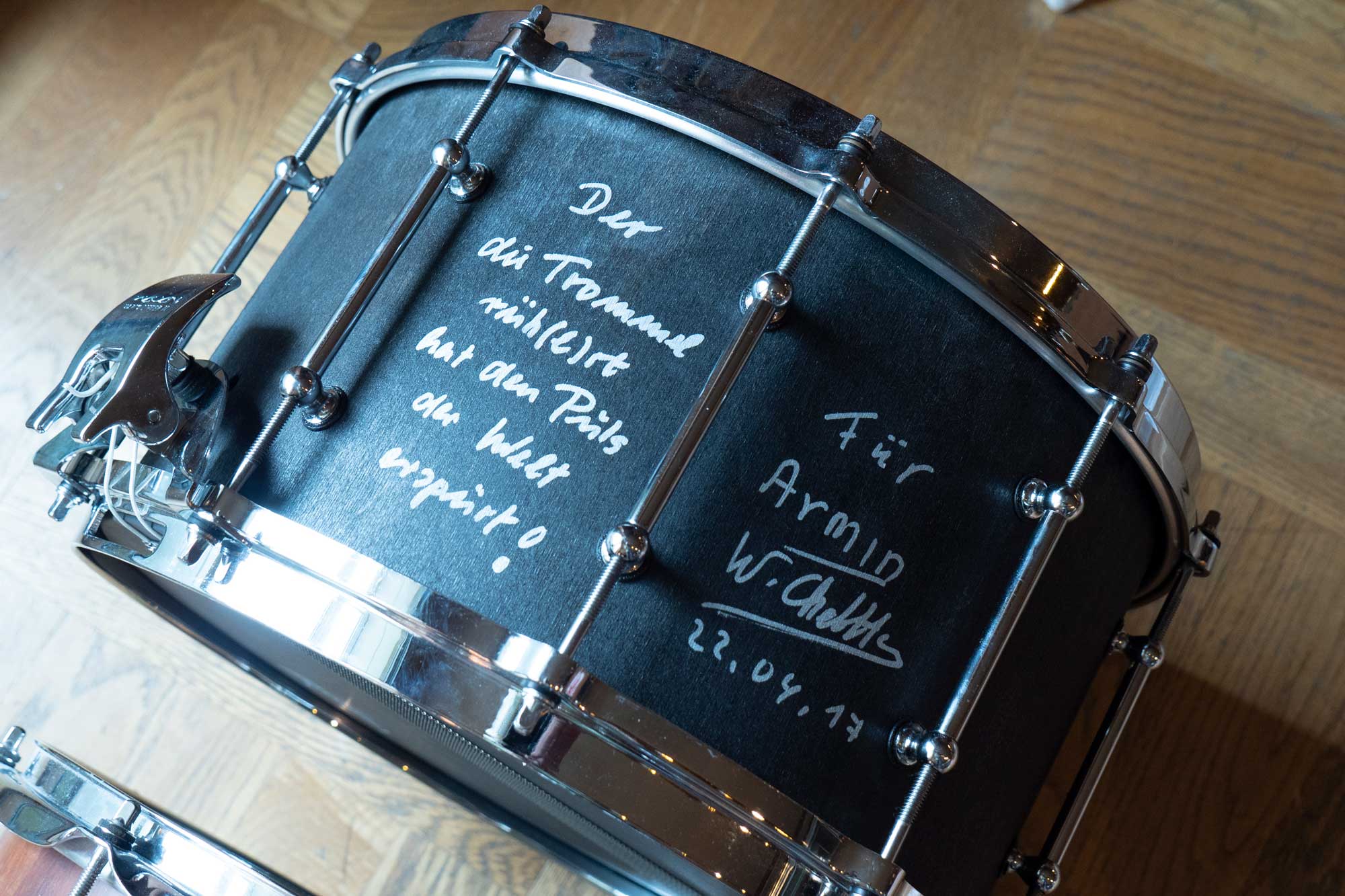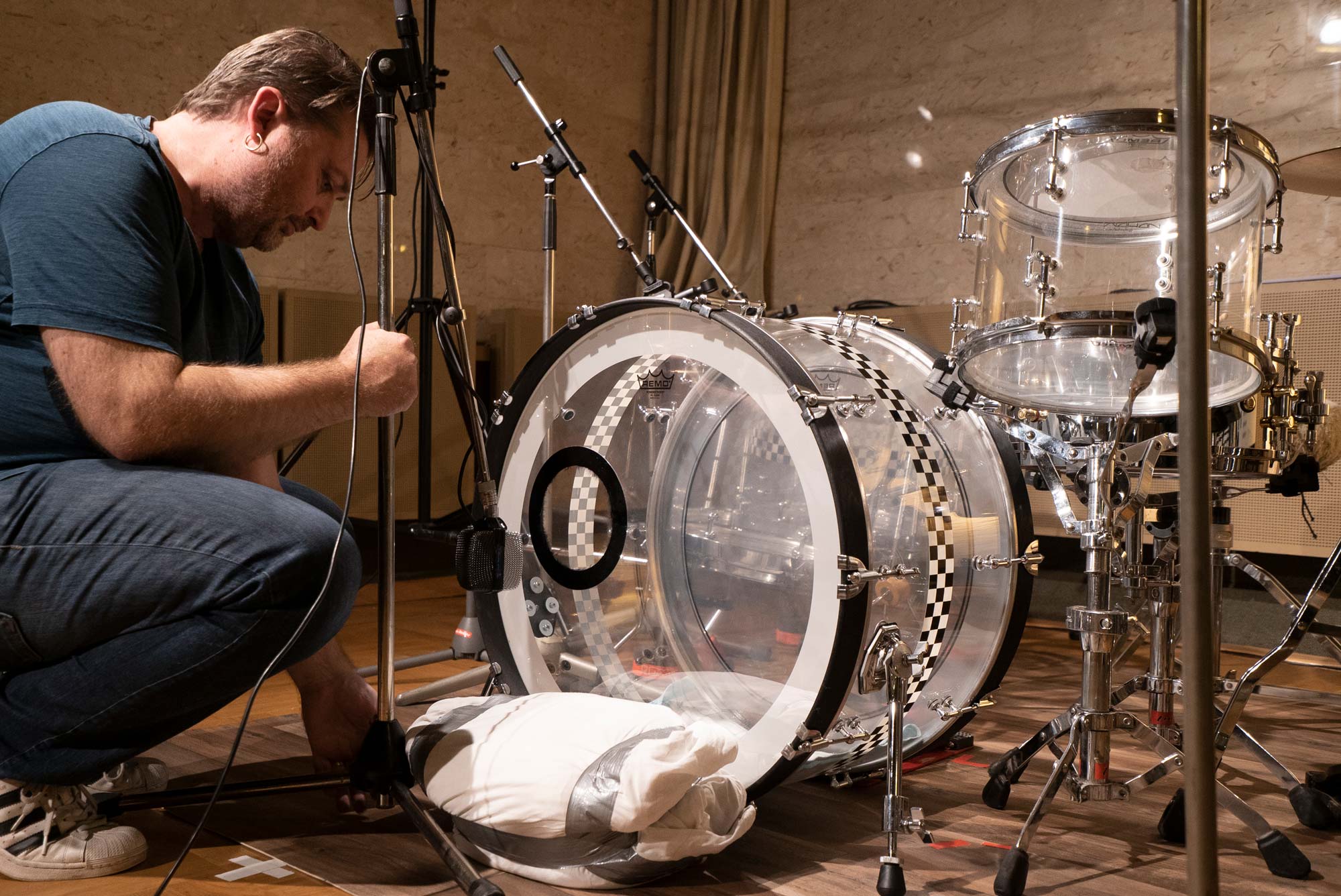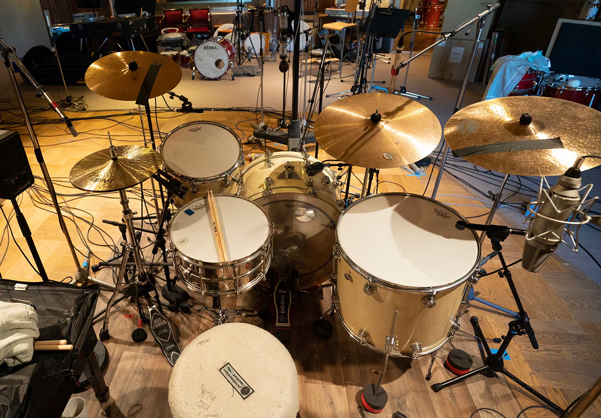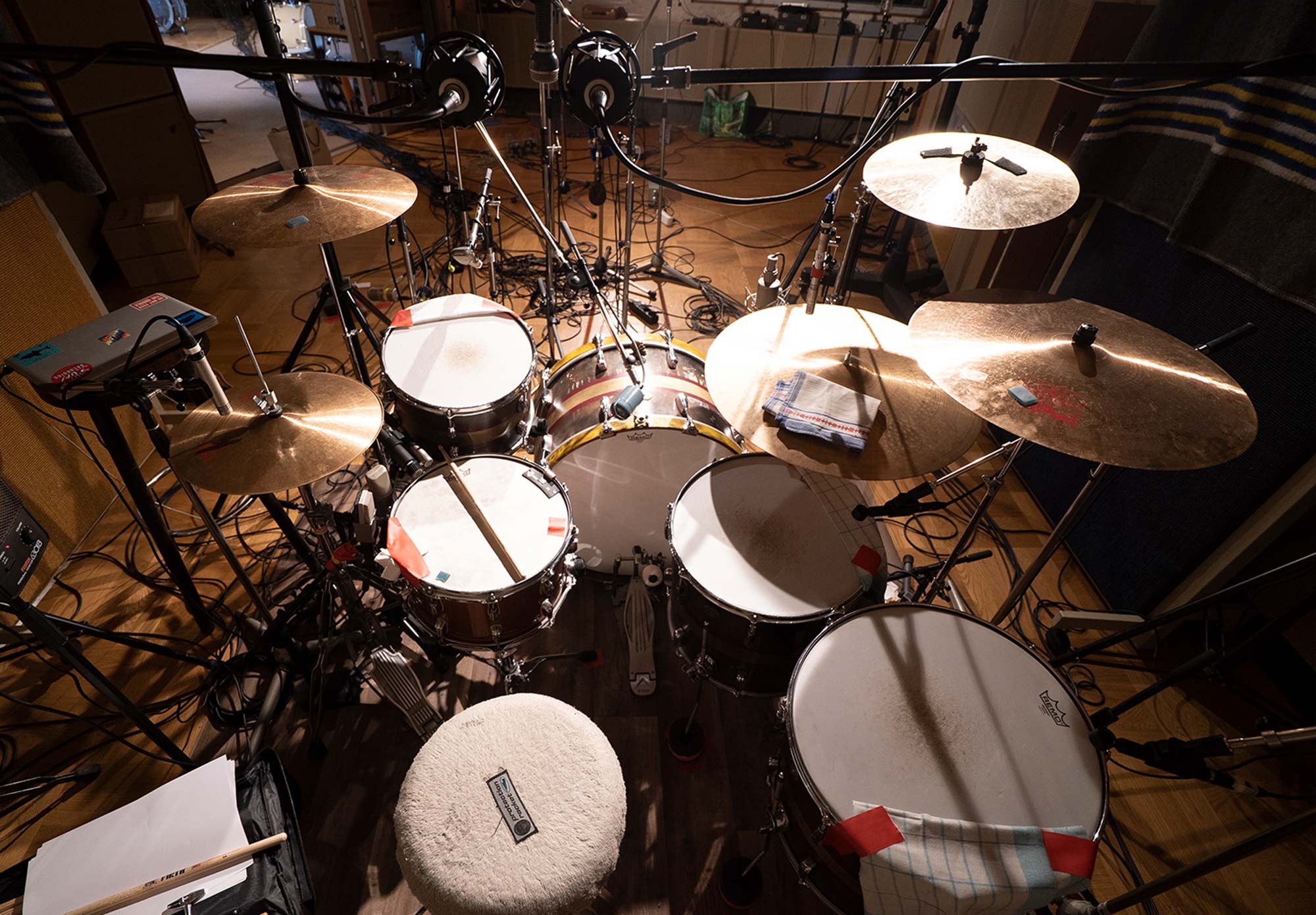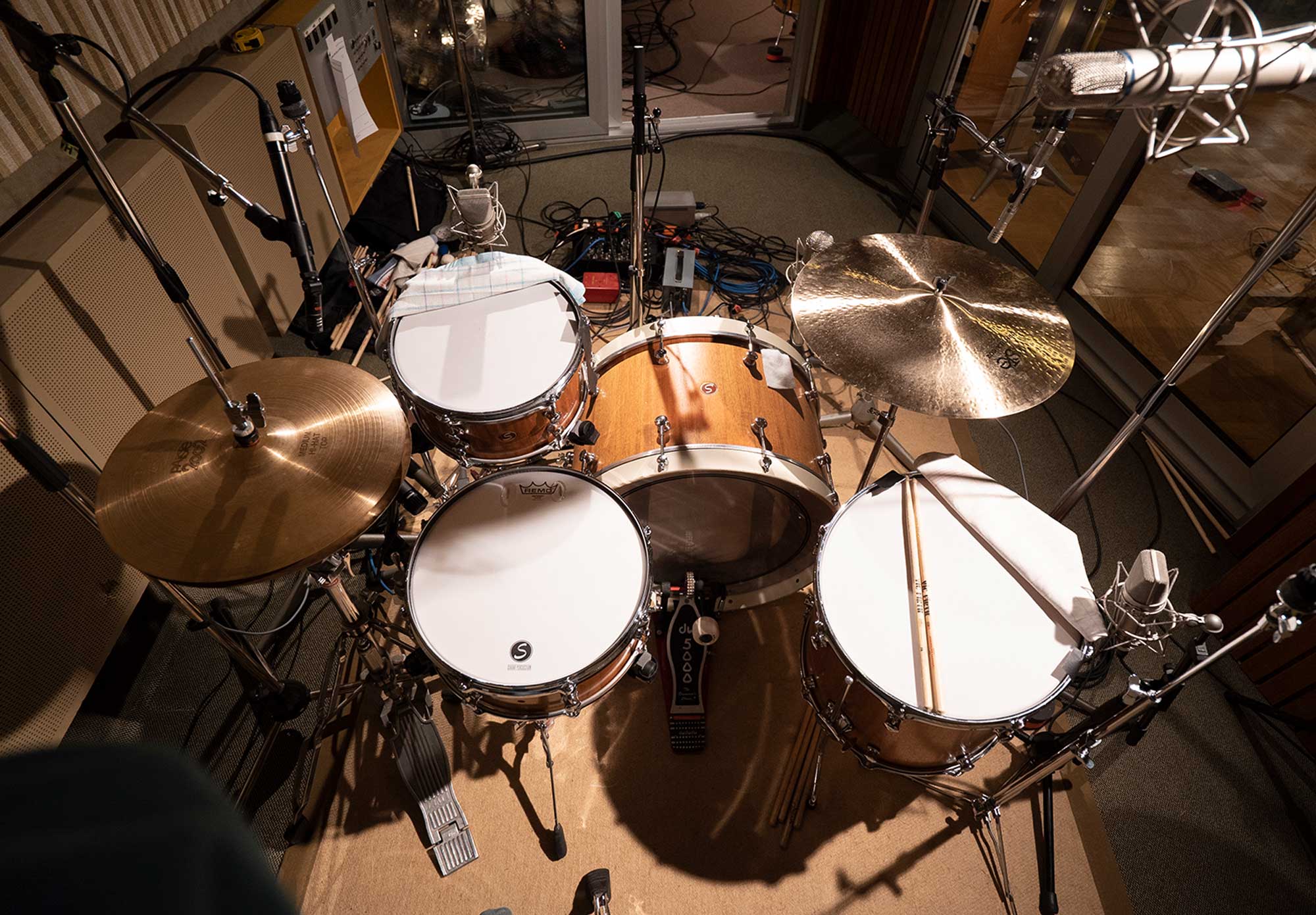 As an alternative, we recorded the Twin Shell Kit in a more damped way by applying tea towels to the toms. We also added Michael Ilbert’s personal and favorite Masshoff* snare drum, the mighty 14×8″ “Big Chief” – a pure powerhouse made of stainless steel.