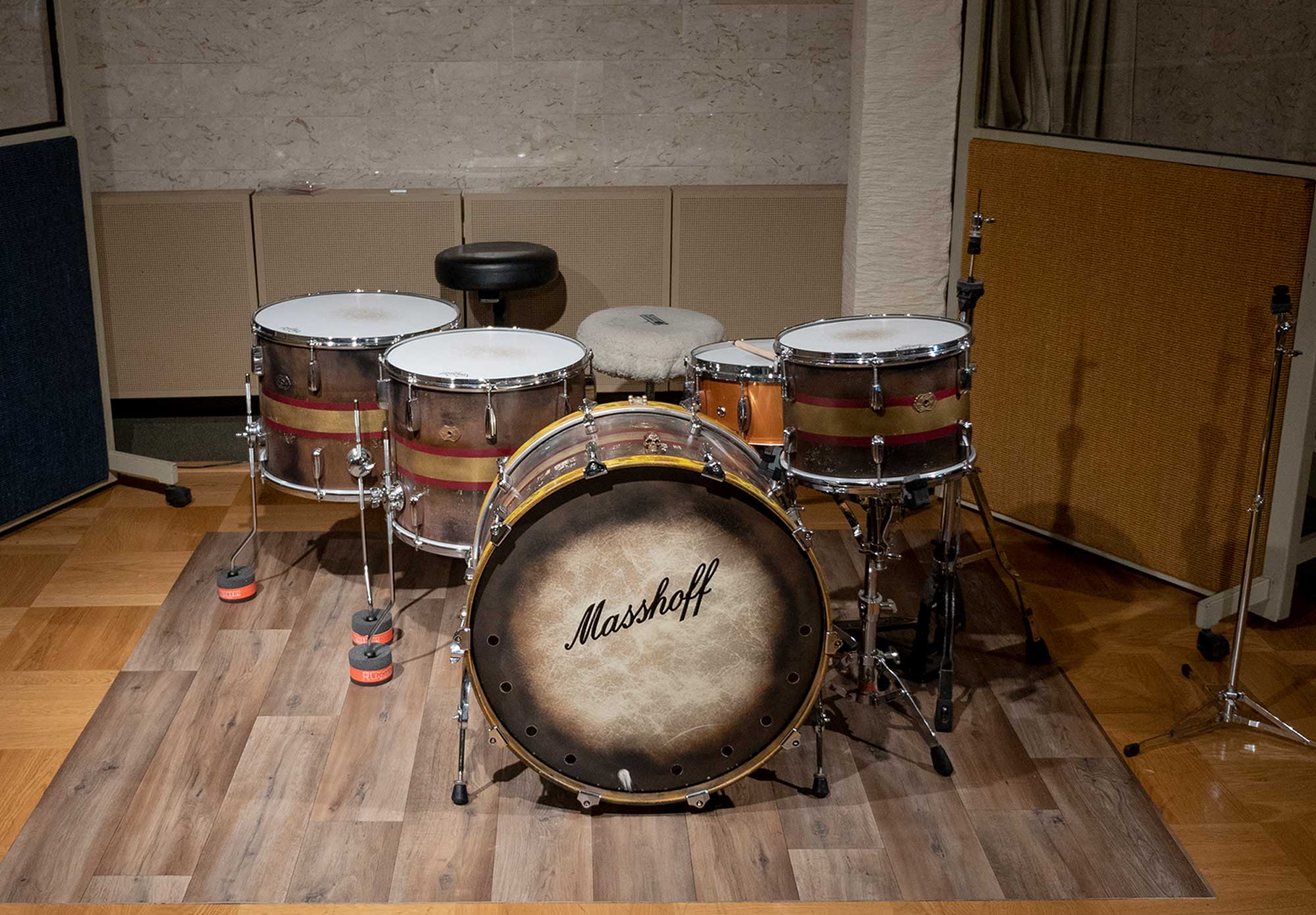 This is a very special kit, custom-built by Berlin-based boutique drum manufacturer Udo Masshoff. The stand-out feature in these drums is the the so-called “twin shells.” These shells make use of both steel and maple, resulting in drums that produce very warm, powerful and unique tones with an amazing frequency range.
