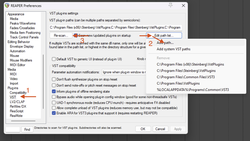 After installing a Toontrack plug-in you will need to let REAPER know where the new VST plug-in is installed. Depending on your operating system and the bitness of the plug-in, the location can be slightly different.