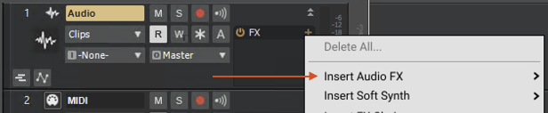One way to then add an effect plug-in to the track would be to open the FX menu and then “Insert Audio FX”.