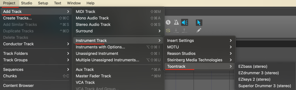 Open the Project menu and select “Add Track > Instrument Track > Toontrack”. Click on the plug-in that you want to add to the new track: