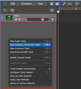 If you do not already have a track that you want to add a virtual instrument to, right-click the track area (marked in red in the picture below) and select “New Software Instrument Track”.