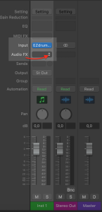 Click on the arrows to the right in the Audio FX box in the mixer for the channel you want to add an effects plug-in to. Navigate to the Audio Units > Toontrack folder and select your installed Toontrack effect plug-in (like EZmix).