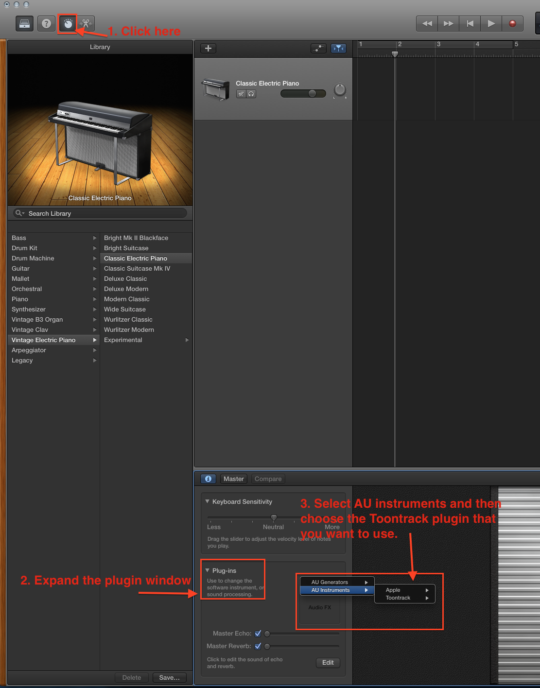 For older version of Garageband please see this video.