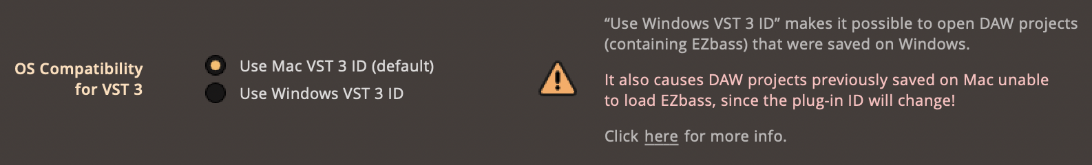 Projects using the EZbass VST 3 plug-in saved on Windows cannot be loaded on macOS and vice versa due to how the identifier for the VST 3 plug-in is reported by EZbass, and this bug can unfortunately not be fixed without ruining old projects on one platform. We have, however, introduced a toggle in the advanced settings that allows you to work around this issue in EZbass version 1.2.0 and onwards.