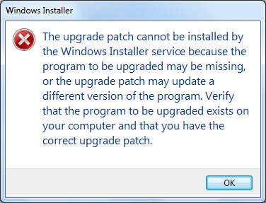 If you are getting the error message “The upgrade patch cannot be installed the Windows Installer service because the program to be upgraded may be missing, or the upgrade patch may update a different version of the program. Verify that the program to be upgraded exists  on your computer and that you have correct upgrade patch.” you most probably are attempting to install a product update without having the full product installed prior to applying the update.