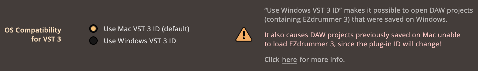 Projects using the EZdrummer 3 VST 3 plug-in saved on Windows cannot be loaded on macOS and vice versa due to how the identifier for the VST 3 plug-in is reported by EZdrummer 3, and this bug can unfortunately not be fixed without ruining old projects on one platform. We have, however, introduced a toggle in the advanced settings that allows you to work around this issue in EZdrummer 3 version 3.1.0 and onwards.