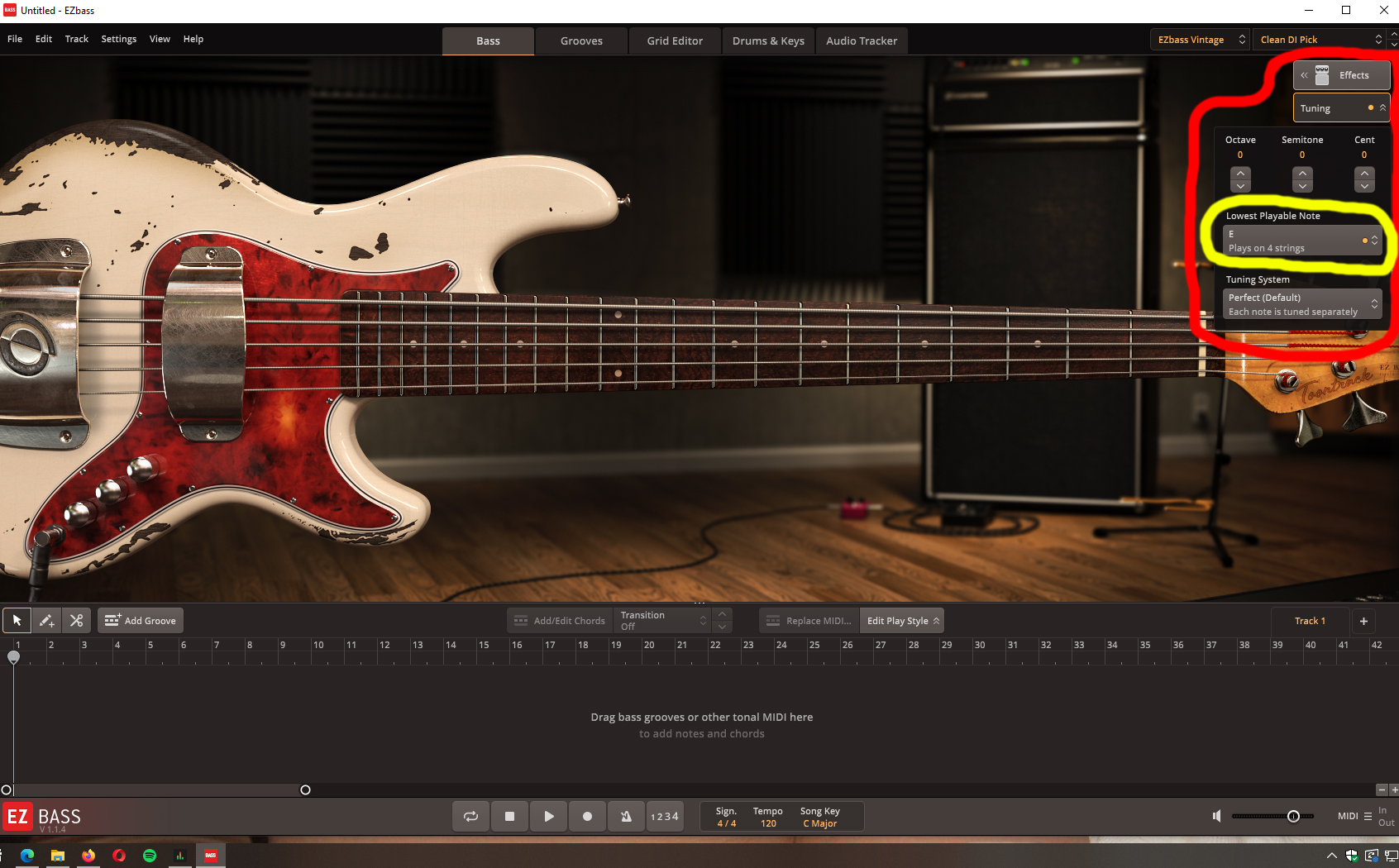If I use one of the existing groves in EZBASS, will it always be based on the “B” string as the lowest note? Is there any setup to fix 4 strings or to fix “E” as the lowest note? Let me explain why it is important to me. On EZDrummer and EZKey, I can easily print out the score of the arrangement and give it to a player for live performance. It was important to do the same on the EZBass without being conditioned by the 5 strings.